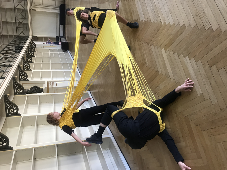 We continue, somehow more focused now that the placements are divided. The atmosphere is playful, and the dancers explore the movement possibilities in their wearable parts and explore how their placements impact the group.
