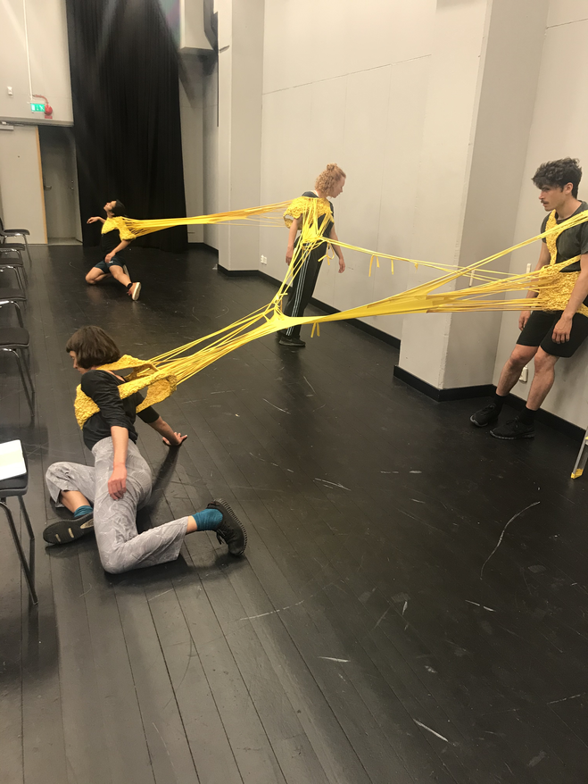Here we are on the first day (23 June 2020), in a black box studio space at Malmö Theatre Academy, Sweden; four dancers, the bright yellow AweAre costume and me.