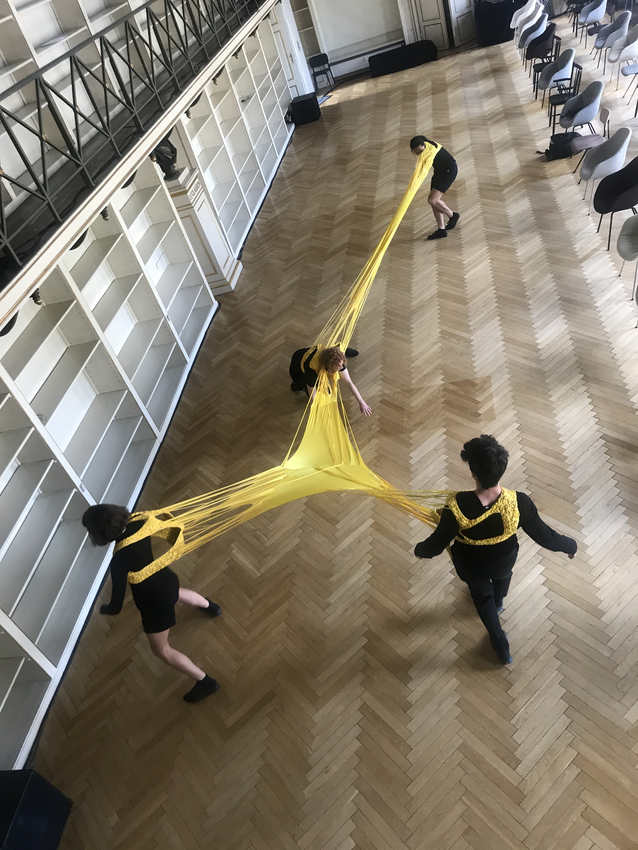 Here we are on the first day (23 June 2020), in a black box studio space at Malmö Theatre Academy, Sweden; four dancers, the bright yellow AweAre costume and me.