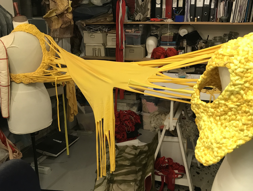 (1) For this KUV (kunstnerisk udviklings virksomhed translates to artistic research) project, Textile Techniques as Potential for Developing Costume Design, (2016/2017) I invited three tailor colleagues (employed) at the Danish National School of Performing Arts to join me. Side by side and in dialogue we (individually) developed several costumes using crafting techniques inspired by braiding. One of my research ambitions was to invite the tailors to make costumes from a perspective different to that of their daily work at the school. As they usually produce costume in collaboration with and from drawings made by scenography students, they never develop their own costume ideas. As I was challenging the tailors, I also wanted to challenge myself. Therefore, I intentionally chose a role of stretchable material that the tailor workshop had stored for years which I did not find particularly inspiring. The textile smelled and its yellow colour was a bit too murky to my taste.