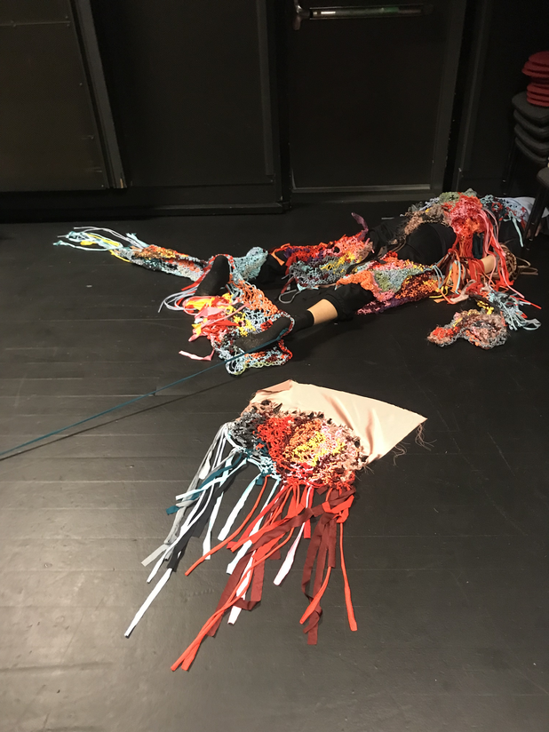 The next day we returned to the black box where we tied all the knotted pieces in-process together and to one object. However, this object read as a fashion idiom that mainly called for posing. Then we decided to explore different ways of responding, which had some potential.