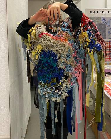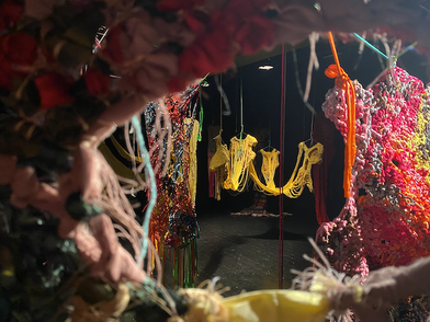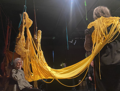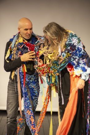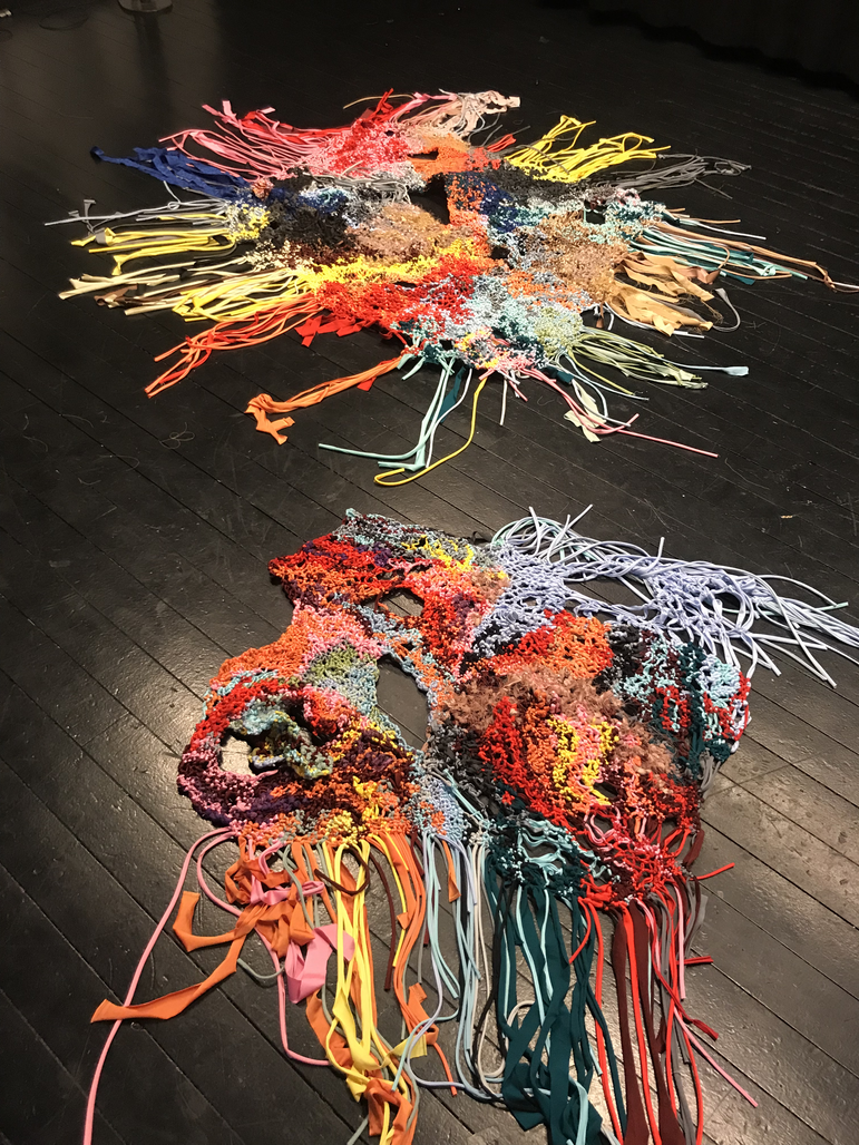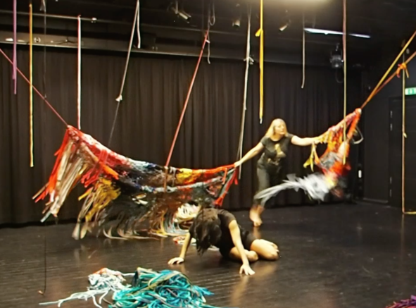 Photos from the KUV-project Textile Techniques as Potential for Developing Costume Design (2016/2017): from the final presentation of the project and two images of students (The Danish Naional Schoolof Performing Arts) that explored the connecting costumes.