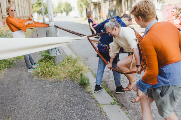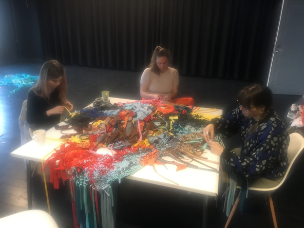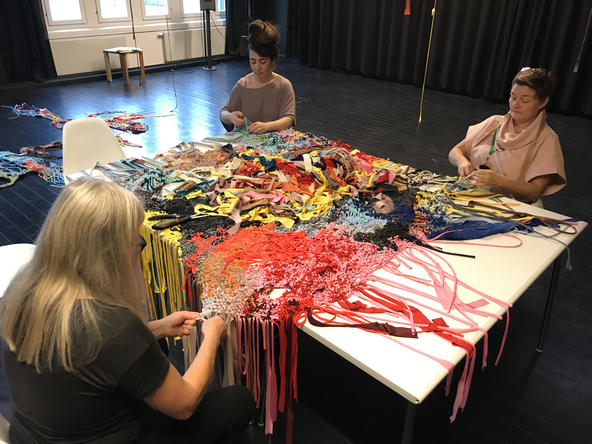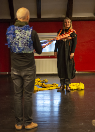 In The scenographic, costumed chorus, agency and the performance of matter: A new materialist approach to costume Donatella Barbieri and Greer Crawly (9) argue that in costume new materialism become “ethical negotiations in which [there] is a re-balancing of human and non-human matter” (Barbieri & Crawley 2019, 144). This re-balancing is “questioning hierarchical and territorial dualism not only in terms of mind/body, nature/culture or subject/object but also in terms of male/female, local/global and present/past [… and] the power asymmetries intrinsic to these binaries” (Barbieri & Crawley 2019, 146). This suggest that we need to revise our design and performance-making production structures. With new materialism as creative partner, we – researchers and designers – must re-evaluate how we collaborate. As my research aims at studying relational and co-creational aspects of costume I do not intend to reproduce structures where someone envisions a performance or an event that the collaborating team materialises by, for instance, visualising, embodying and/or producing specific parts of a production/performance/event. Thus, in the research 1) I do not expect that my co-creators will or must embody a predefined vision of mine, 2) I do not intend to act as an outside observer who watches, witnesses, analyses and/or directs the situations and 3) I have no intention of positioning myself hierarchically above people and materials.