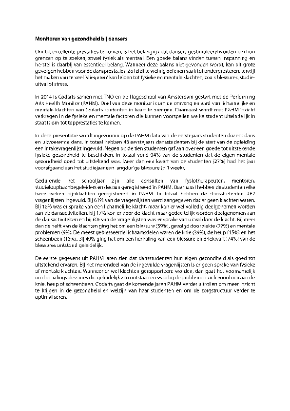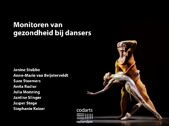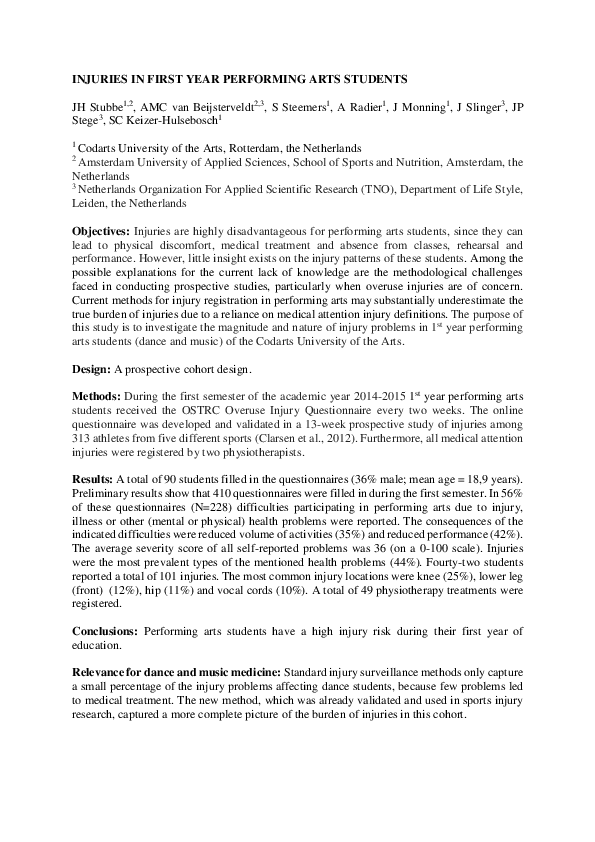 Injuries are highly disadvantageous for performing arts students, since they can lead to physical discomfort, medical treatment and absence from classes, rehearsal and performance. However, little insight exists on the injury patterns of these students. Among the possible explanations for the current lack of knowledge are the methodological challenges faced in conducting prospective studies, particularly when overuse injuries are of concern. Current methods for injury registration in performing arts may substantially underestimate the true burden of injuries due to a reliance on medical attention injury definitions. The purpose of this study is to investigate the magnitude and nature of injury problems in 1st year performing arts students (dance and music) of the Codarts University of the Arts.