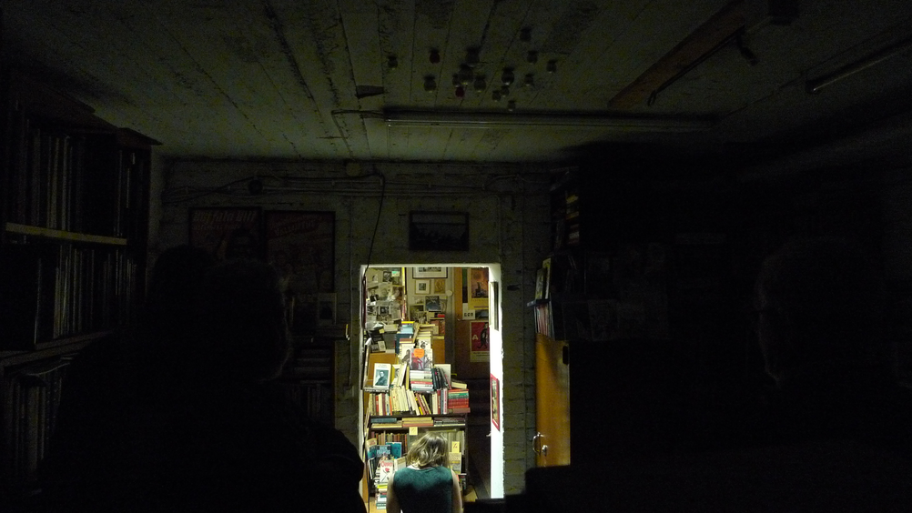 Koin pysähtyneisyyden, suljetun kirjakaupan kiehtovan tunnelman. Tuntui, että olimme siellä luvatta, se oli hauskaa. Tutkin paikkoja ja löysin kiinnostavia kuvia ja kirjoja. Tylsistyin hieman ja koin pelkoa ystäväni tylsistymisestä.
