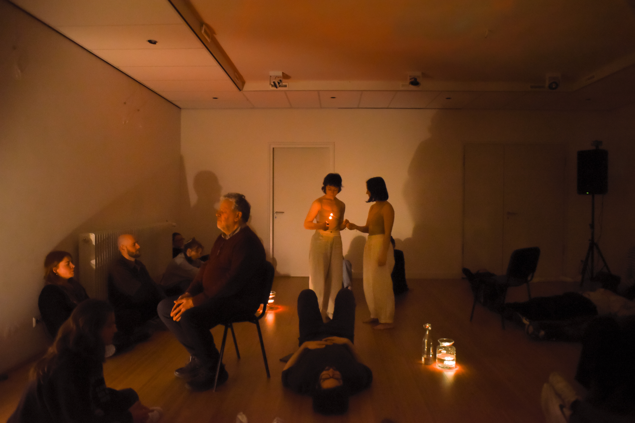 - Fourth role of actions: During the dramaturgical unit of exhaustion in try-out 3, Giuliana and I identified a role beyond Gester’s existing categories of leading, accompanying, and contrasting actions. We termed this the simultaneous or parallel role - neither fully leading nor merely accompanying. As we pursued a shared goal (liberation through exhaustion and pain), our focus remained intensely individual, inducing a quasi-meditative state. This hybrid role blurred hierarchy, embodying a form of co-leadership that embraced both collective and individual experiences.