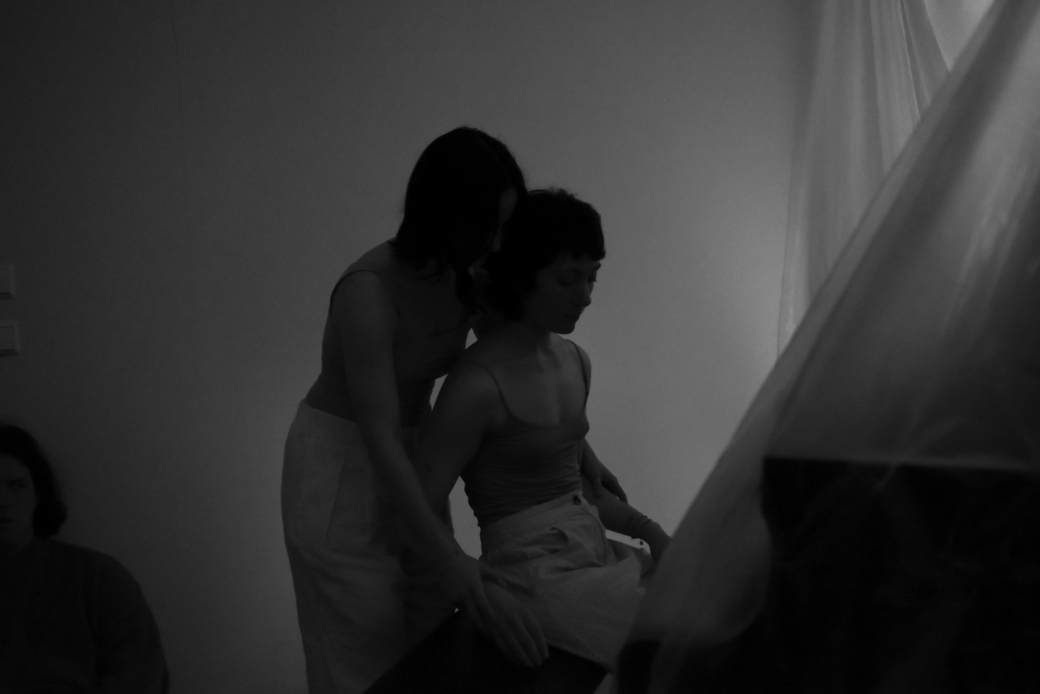 Later, while improvising movement during the second try-out, I broke the fourth wall, meeting the audience’s gaze in a moment that felt familiar. I was fully present, yet silent. My instinctive response was to approach individuals and make gentle physical contact—a way of negotiating the tension between my presence and the absence of verbal engagement. This action was unplanned, emerging spontaneously within the improvisation, yet it became a pivotal moment in reconsidering the dynamics of audience-performer interaction.