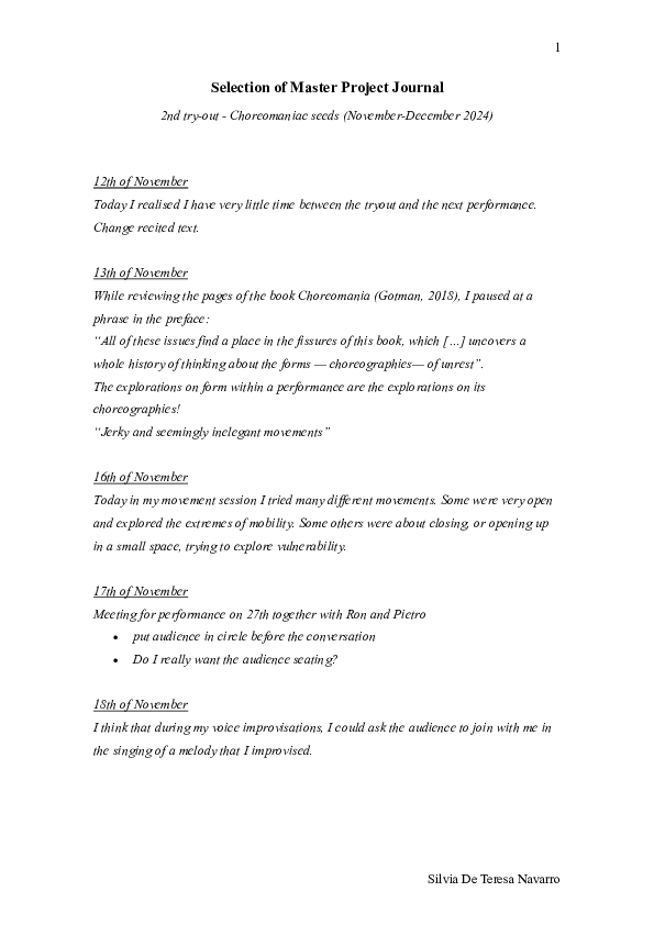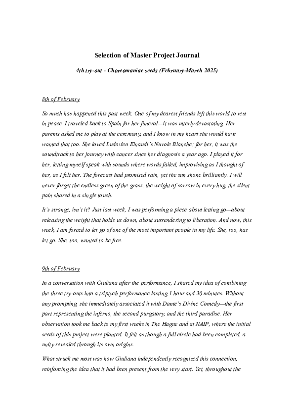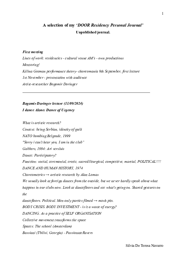 The following document is a selection of my ‘DOOR Residency Personal Journal’. It contains only relevant thoughts or notes during my internship at the residency. Structured as dated entries, the journal combines fragmented notes with reflective passages, creating a spontaneous and raw collection of thoughts. It shifts between concise, functional points and fluid, introspective writing, capturing both documentation and personal interpretation.