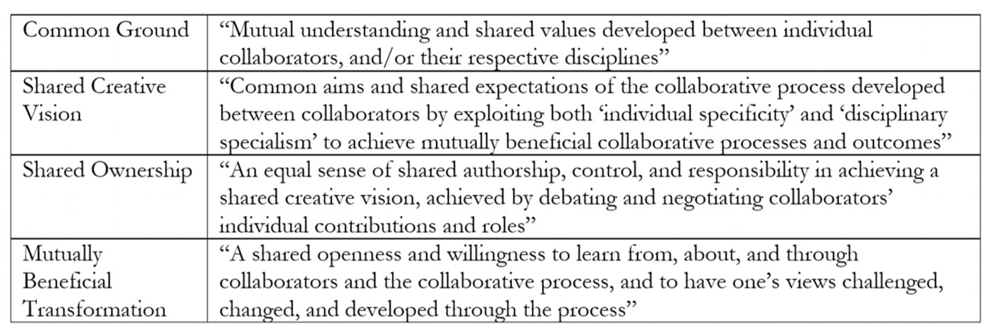 This table (figure 3) is highly insightful, as it not only clarifies the key characteristics of successful collaboration but also identifies specific actions that shape different types of interactions. The four possibilities Taylor identifies are hierarchical, co-operative, consultative, and collaborative working. If the imagination of ideas is not shared, the resulting working environment can only be either hierarchical (if the evaluation of ideas is also not shared), or co-operative (if the evaluation of ideas is shared). Similarly, if the evaluation of ideas is not shared, the resulting working environment can only be either hierarchical (if the imagination of ideas is also not shared), or consultative (if the imagination of ideas is shared). Collaborative working can only emerge when both imagination and evaluation of ideas are shared. Notably, it adopts a less judgmental tone by avoiding a binary evaluation of success or failure, instead focusing on how certain actions (imagination and evaluation of ideas) influence the collaborative process. Moreover, drawing from her own artistic practice, Hellqvist highlights the fluctuating levels of interaction throughout the creative process. Citing John-Steiner, she reinforces the importance of a “shifting rhythm of interaction” (Hellqvist 2025), which she experienced during her process with another artist, identifying herself fluctuating within co-operative and collaborative working.