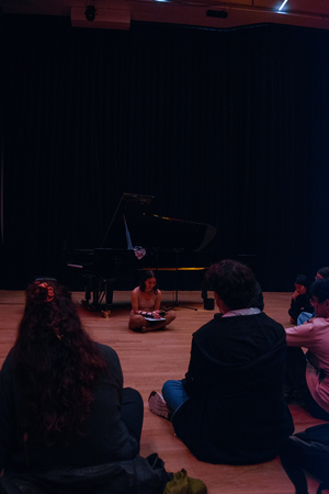 The try-out, along with subsequent reflection, helped clarify what worked and what needed improvement. Despite this being my first time publicly incorporating voice and movement into my practice, I felt comfortable improvising with these elements. This gave me the confidence to push further in expanding my expressive range. The combination of red and yellow lighting, along with the positioning of the piano and live electronics station, created an engaging and mysterious atmosphere. Audience feedback also highlighted the effectiveness of my initial positioning in the space.