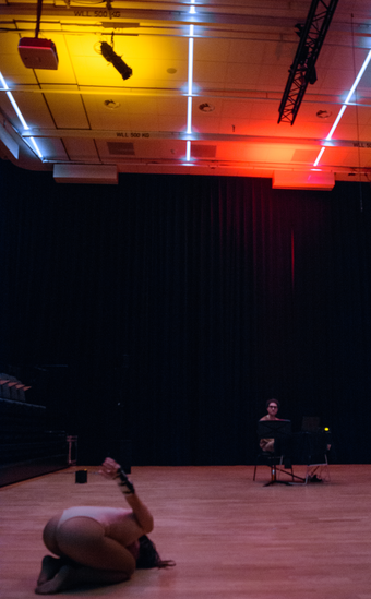 My approach to movement in this performance was heavily influenced by Alexandra Cassirer, particularly in gesture, and by ELLE FIERCE in audience interaction. The movement was largely improvised, with a sense of urgency evident in my rushed pacing around the space.