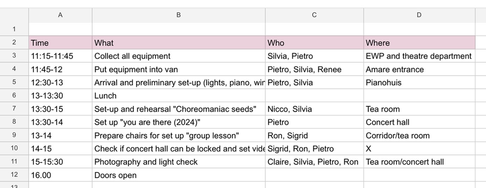 Building on this idea, the timeframe leading up to a performance plays a crucial role in the creative process. I see it as an independent component in performance-making, as it significantly influences the decisions made throughout the process. However, in Gester’s Map of Components, this factor is scarcely acknowledged. Considering that his framework is a guideline for the process of creation, I take this opportunity to expand on his framework by emphasising the impact of time constraints on artistic choices throughout the process of shaping performances.