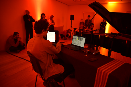 Audience surrounding piano and live electronics in the centre. |