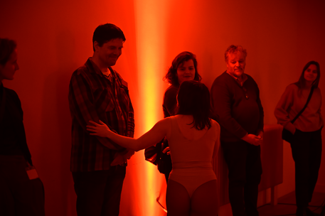 In contrast, the physical interaction - lightly touching participants - felt unexpectedly comforting and even embracing. I was aware that I was crossing boundaries, so I remained careful and intentional, yet the experience felt natural and warm. This moment, like the rest of the movement improvisation, was entirely unplanned. Similarly, when I guided the audience into a collective circular movement, it happened spontaneously, emerging organically from the shared space we had created.