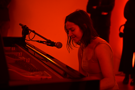 The disposition of the performers and stage was adjusted for this performance. This time, the piano and live electronics were placed close together at the centre of the space. As the audience entered, Niccolò was already facing the opposite direction, leading them to instinctively move around the central stage. However, at the very end of the room, I was positioned on the floor with my hand pointing upwards, creating a sense of shared space and ambiguity about where the audience should position themselves.