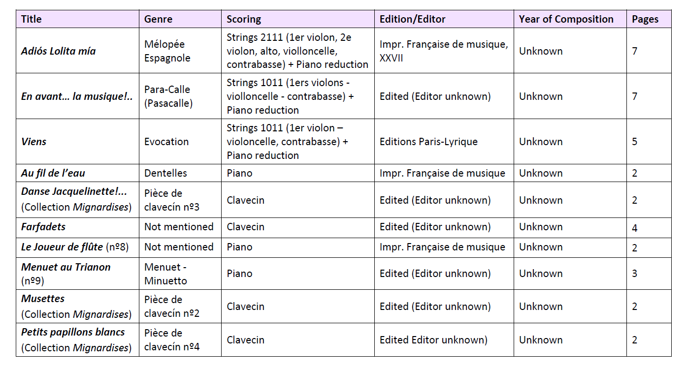 The remaining scores listed in López-Suevos’ catalog were not accessible to me. This limitation was mainly because many of them—particularly those belonging to her French-period compositions—are housed at the “Bibliothèque Nationale de France” or other institutions that I could not visit in person. For instance, I was particularly interested in the piece ¡Adiós a Galicia! due to its strong connection to my homeland and its historical significance, as it was notably performed by Eugenia herself. However, the score is part of a private collection, which I was unable to access.