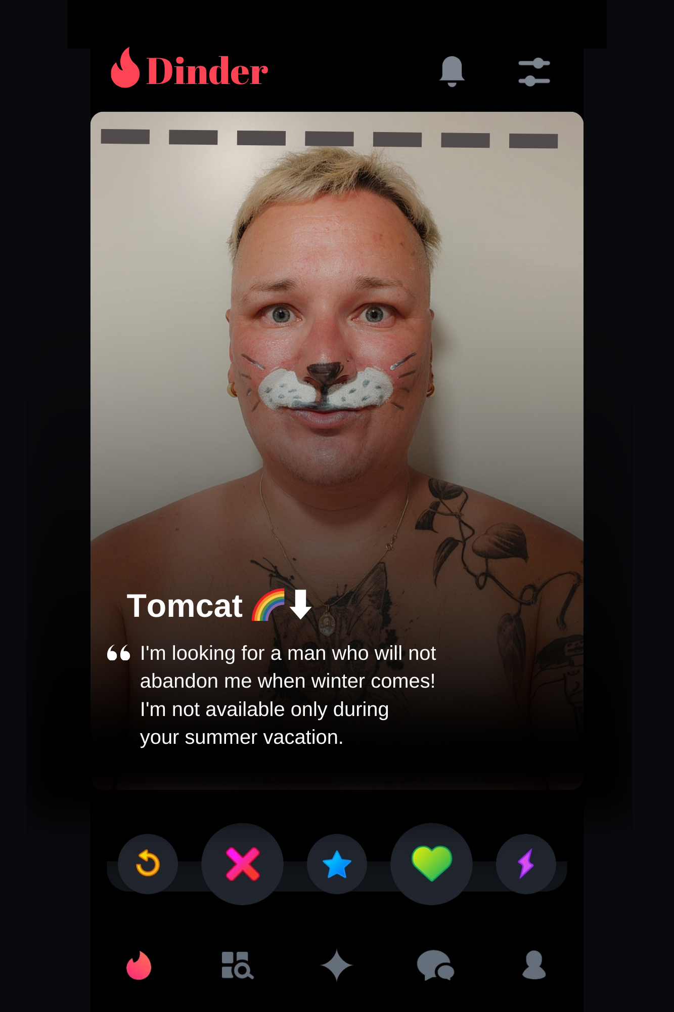I am single after 19 years of relationship and marriage. I've had to learn how to use dating apps while doing my research. Dating experiences started to mix with my research and I started doing related performances for the camera. I edited the photos to look like they were on a dating app.