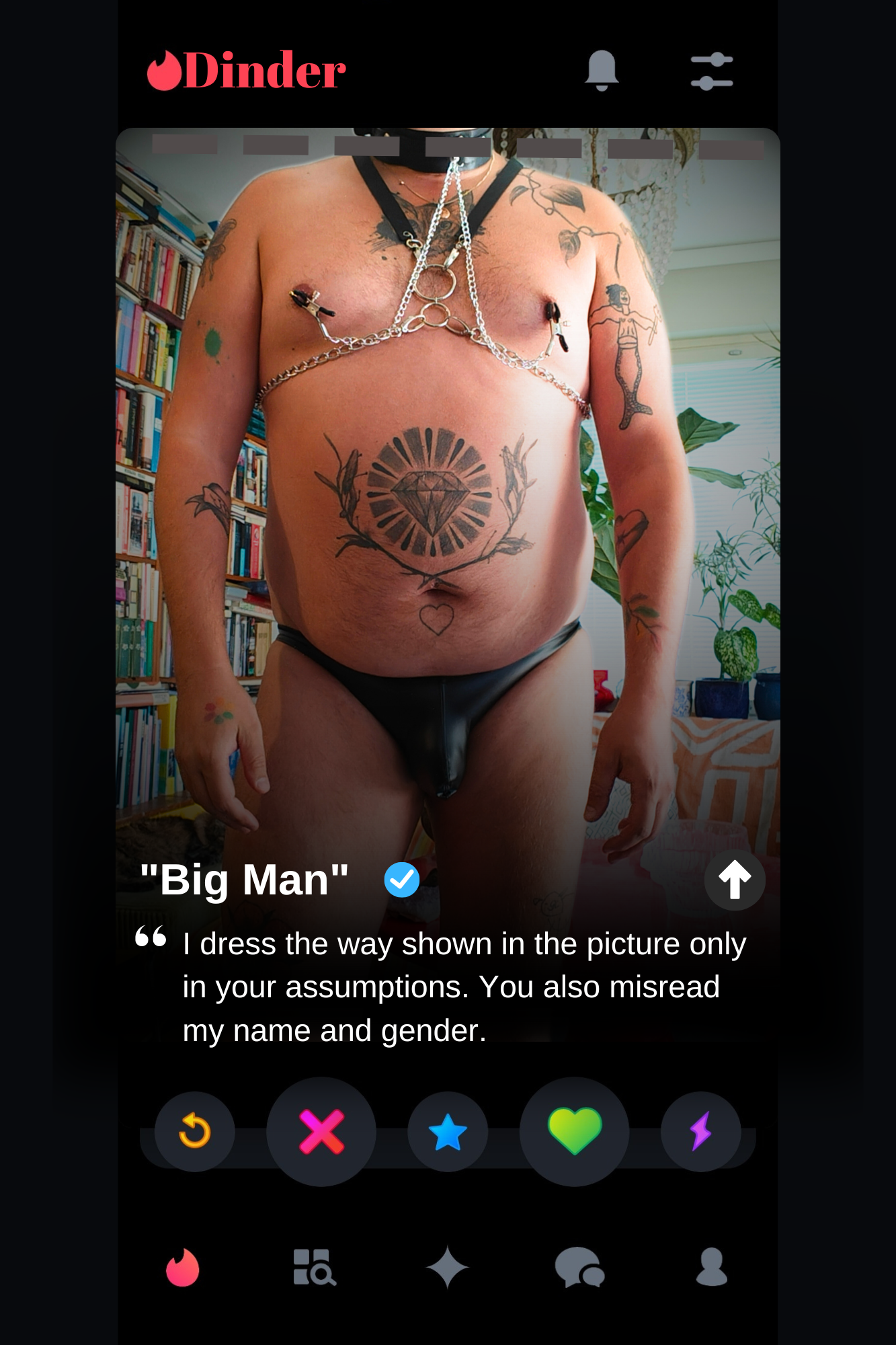 I am single after 19 years of relationship and marriage. I've had to learn how to use dating apps while doing my research. Dating experiences started to mix with my research and I started doing related performances for the camera. I edited the photos to look like they were on a dating app.