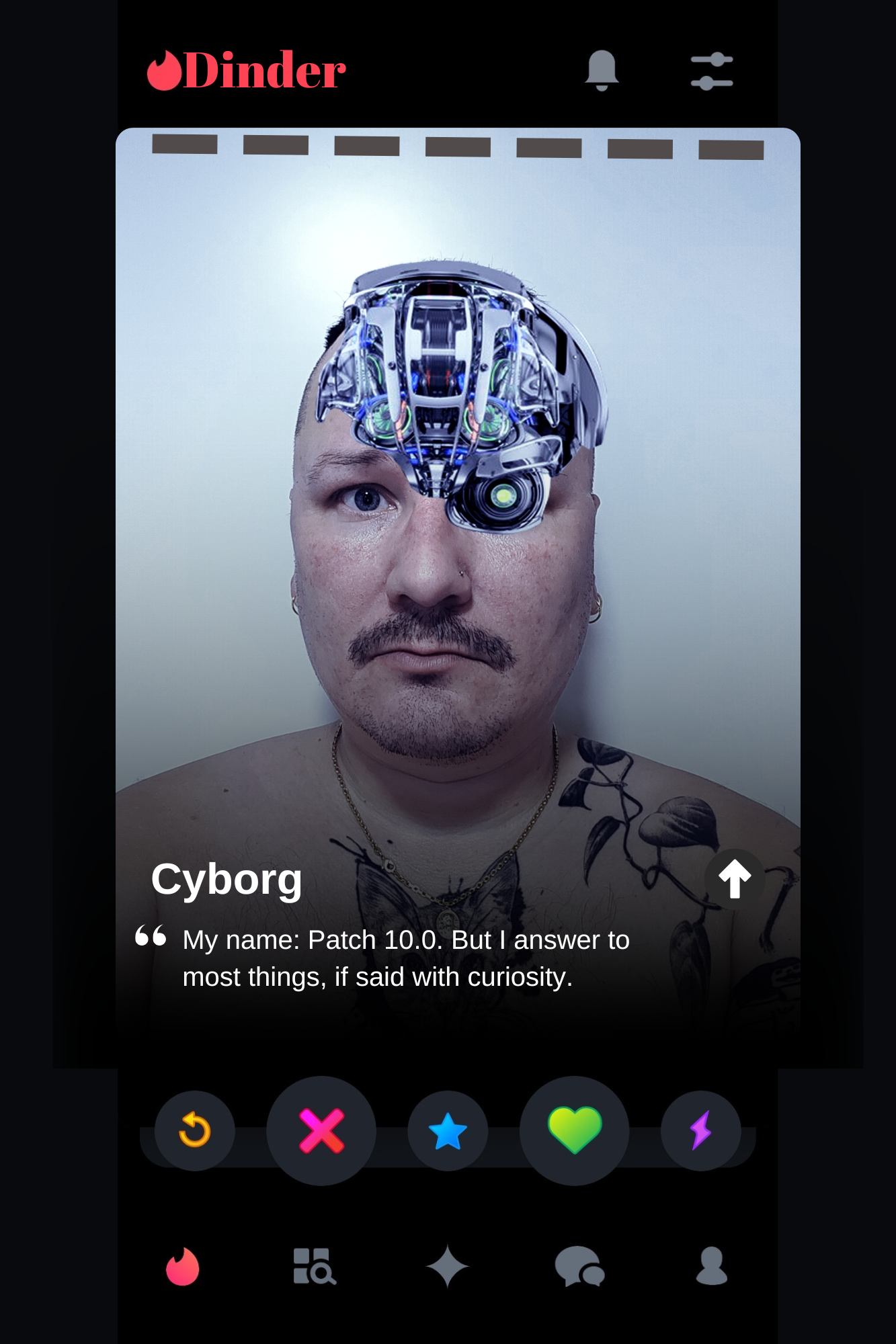 I am single after 19 years of relationship and marriage. I've had to learn how to use dating apps while doing my research. Dating experiences started to mix with my research and I started doing related performances for the camera. I edited the photos to look like they were on a dating app.