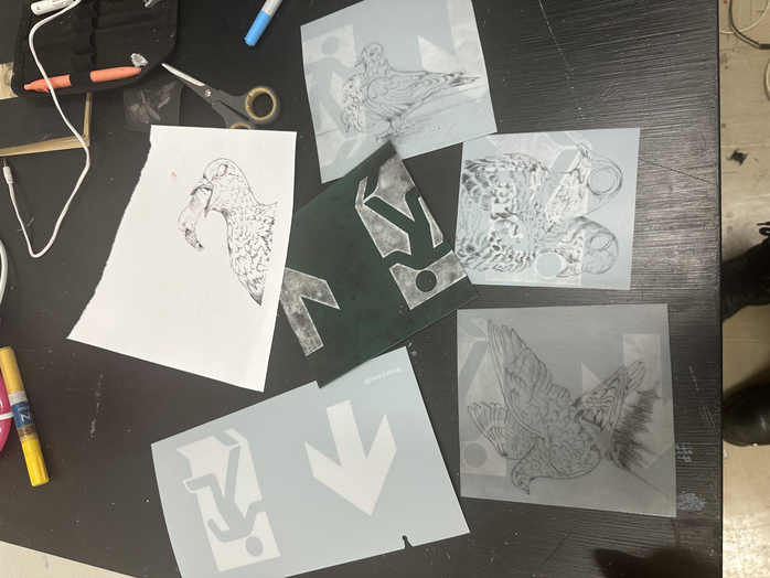 By printing or transferring these graphics onto urban objects like trash cans, street signs, and other surfaces, for connecting the pigeon’s urban symbolism directly to its environment.