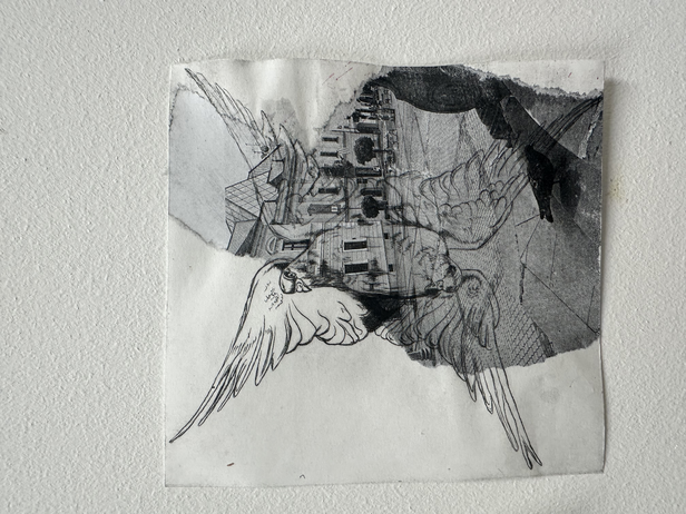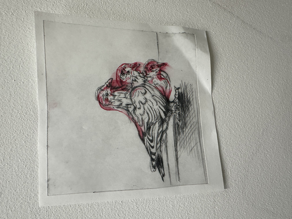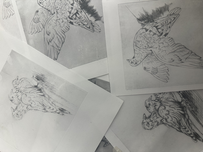 Using drypoint graphic techniques and mixed media, the work captures various stages of mutation, blending pigeons with grotesque and absurd forms.