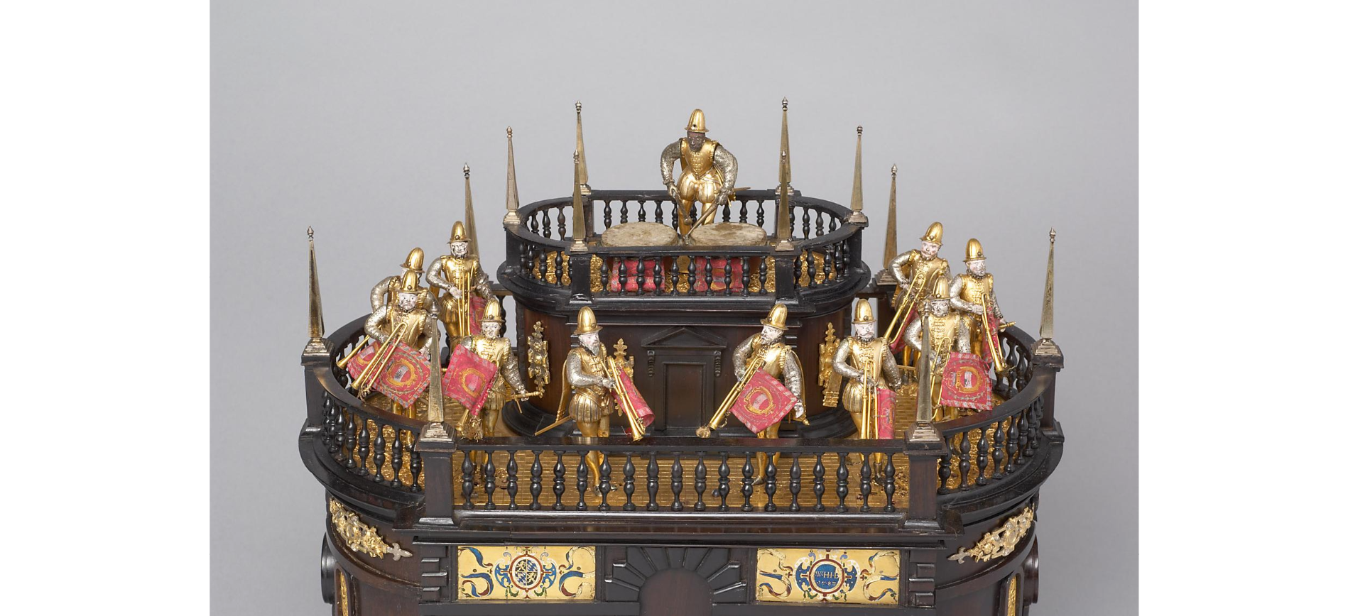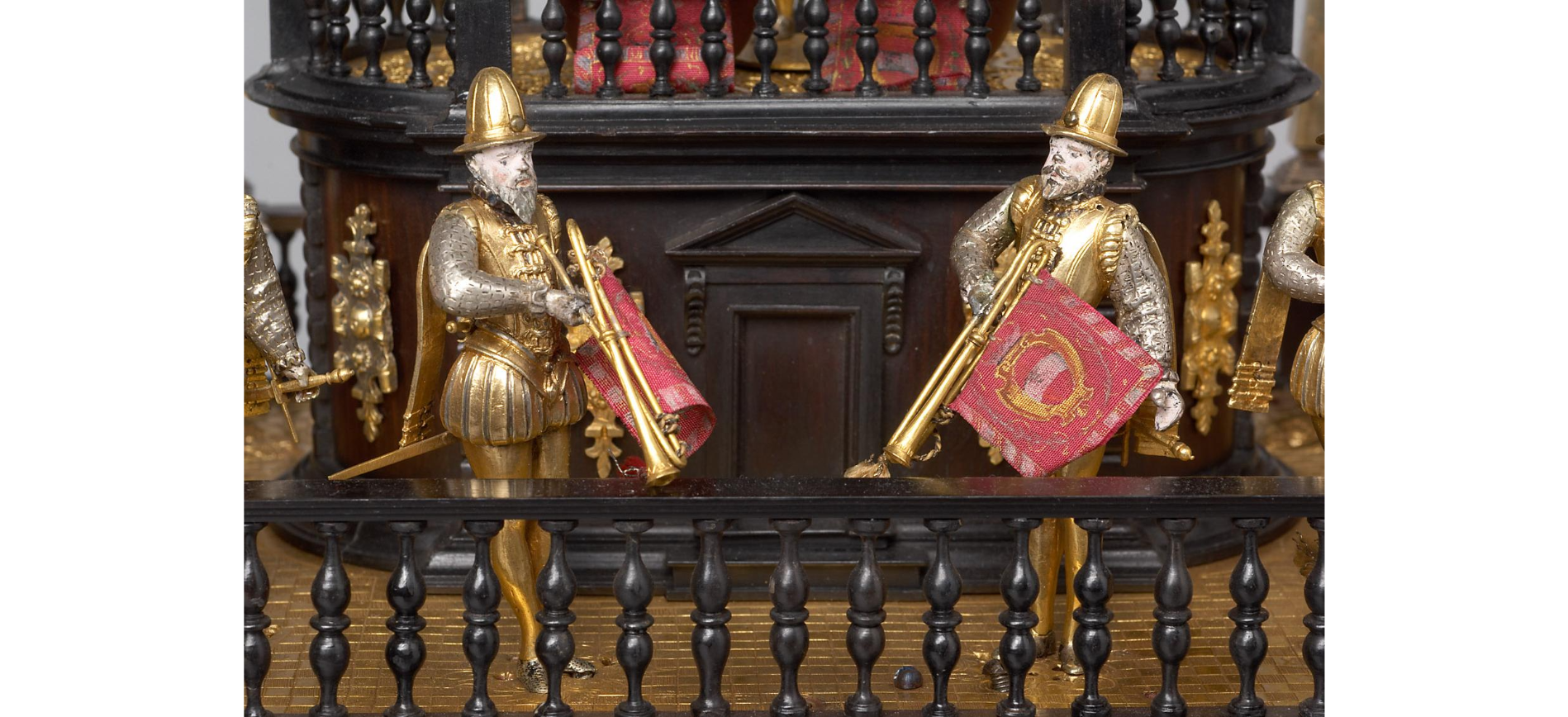 Ironically, the oldest musical example of a courtly trumpet ensemble is not a manuscript or a piece of sheet music but an actual sound example which we can still listen to today. The Trompeterautomat is a music box made by watchmaker Hans Schlottheim (c.1544/47 - 1624/25) in 1582 in Augsburg 42, which depicts a trumpet ensemble playing a short piece with a timpanist. A beautiful and detailed object, richly ornamented, it displays 10 trumpeters in two groups of 5 facing each other with the timpanist placed in the middle, above both groups. Each trumpeter holds a detailed trumpet with the characteristic wide bell and short mouthpiece of 16th century instruments, and it is important to note that despite the timpanist being rather a caricature of an African, larger military kettledrums (such as the ones being played on the box) originally came from the middle east and were still gaining roots in Europe during the 16th century 43, thus there was still a strong association with the exotic. The box itself bears the Bavarian coat of arms, however the trumpeters have the Austrian flag hung on their trumpets, suggesting that it may be depicting the imperial trumpet corps. It would be dubious at best to take the sound of a music box as an absolute truth of historical music practice, but it does confirm that some practices seen in later sources are also applicable in the 16th century. The box confirms that trumpeters played in groups of five and multiples thereof, as stated by Bendinelli 44 and that, during the 16th century, the low trumpets also played drones on the low harmonics, as heard in the music played by the box, such as suggested by Speer in 1697 45. There are also clearly separate principal and clarino parts, individually corresponding to the patterns which we see in Bendinelli’s Tutta l’arte della Trombetta. However, it is hard to hear a connection between the timpani, principal, and clarino, they seem to play quite individually. Possibly, this could indicate that trumpet ensembles were not too bothered by their playing not quite being together, or perhaps more likely is that this un-togetherness stems from the object being an early music box. Finally, an important clue from the Trompeterautomat is that the groups of 5 trumpeters seem to play one after another until the end, indicating that the multiple repeats seen in Bendinelli, Thomsen and Lübeck could be played by separate groups, a sort of call-and-response.