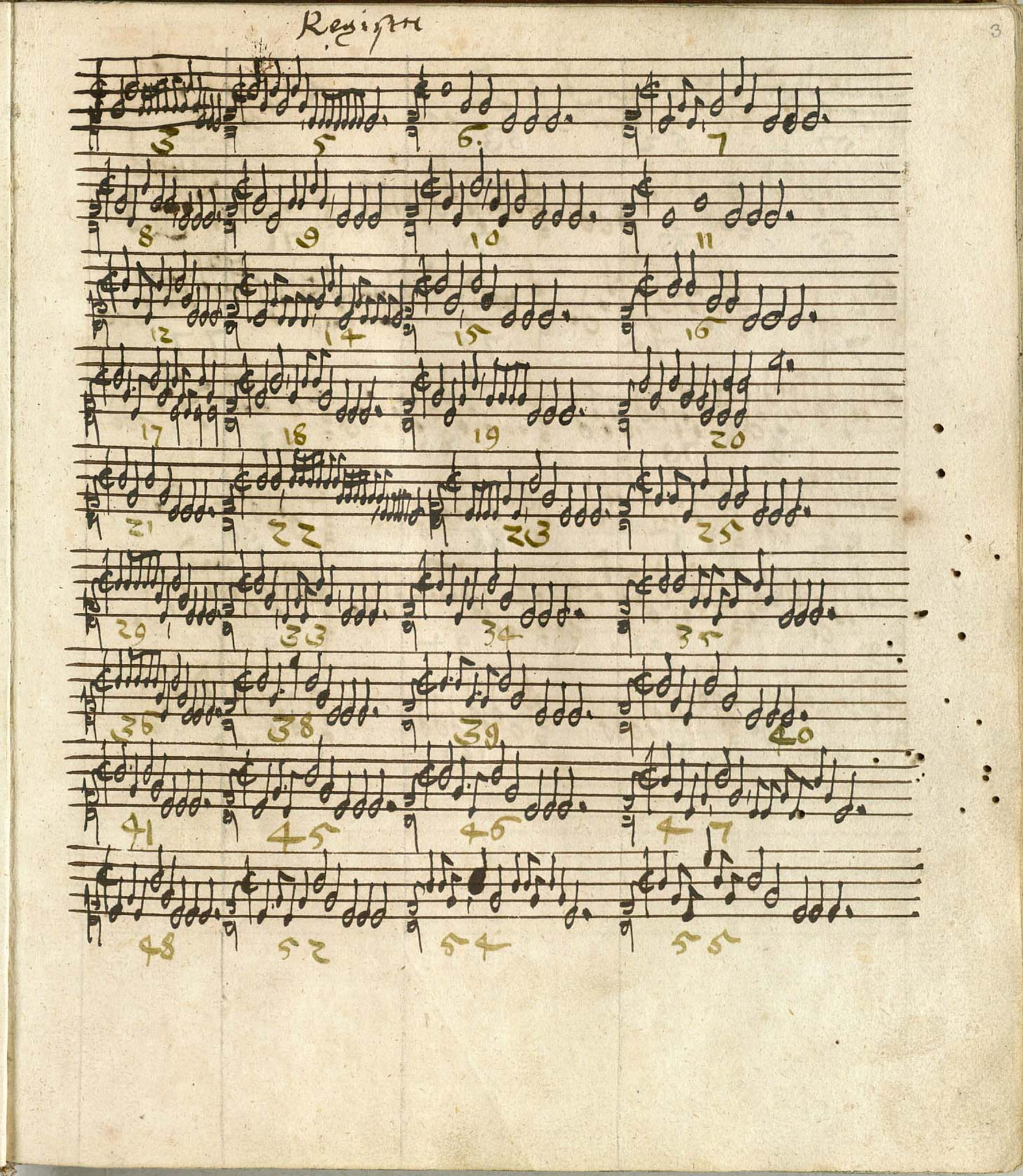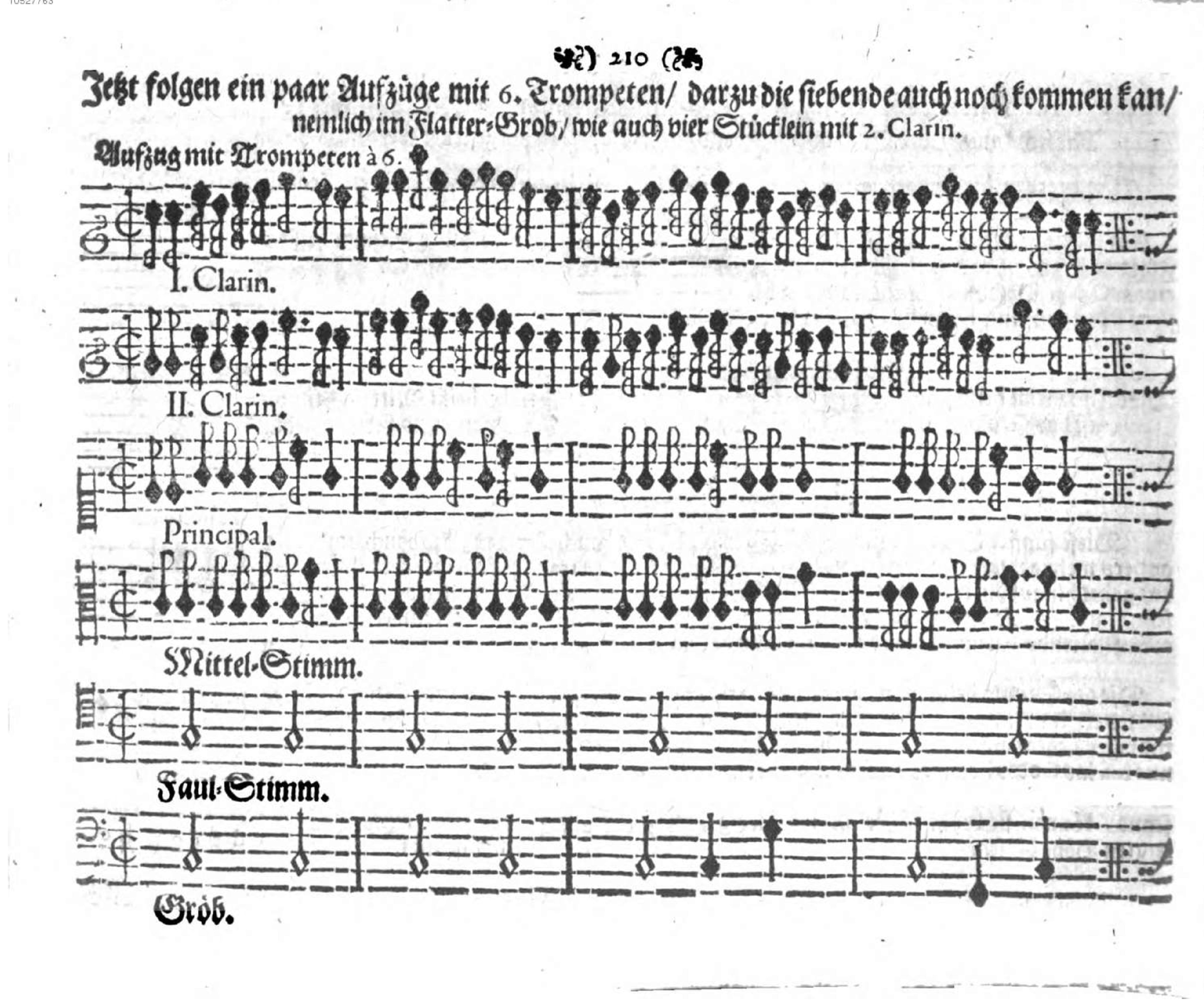 One of the most unique aspects of these manuscripts is that all of the music, except a few examples, is written in the principal register. Both Thomsen and Lübeck worked at a rich court with a lot of trumpeters and had apprentices, an honour reserved for experienced trumpeters 3; they must have been formidable trumpeters. Yet they wrote all this music in a register which is today considered suitable for beginners, while any serious piece of later trumpet music intended for professionals will go well into the upper octave. We must consider the function and purpose of their manuscripts as well as the culture of trumpet playing. The role of the Hoftrompeter or head trumpeter was to lead an ensemble where every piece of music or signal had to be learned by heart and memorized 4, and there could be dozens of different signals which would be changed frequently so that the enemy armies would not catch on to the meaning of the signals 5. The tradition of trumpet playing was completely oral and was explicitly kept secret within the trumpet guilds 6. Thus, the most important qualities of a trumpet player would not have been virtuosity, but the knowledge of signals and the ability to memorize. The head trumpeters had to lead, therefore they had to know all of the music to be able to lead the ensemble and to be able to teach the signals.