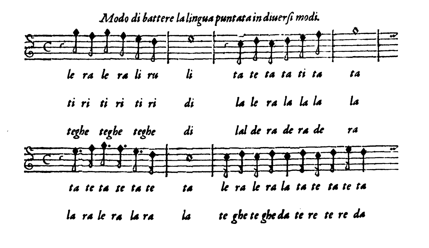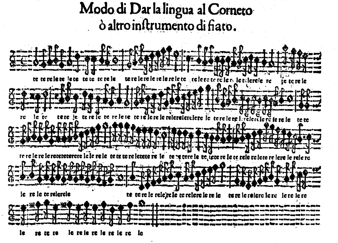 The most extensive source on early baroque trumpet playing is Girolamo Fantini’s Modo per Imparare a sonare di Tromba, Tanto di Guerra Quanto Musicalmente in Organo, con Tromba Sordina, col Cimbalo, e ogn’ altro istrumento published in 1638. The title translated to English: “A method to learn to sound the Trumpet, both in War as in Musical Harmony, with Muted Trumpet, with Harpsichord, and any other instrument”, it is the oldest method book for the trumpet and the first to present music for solo trumpet accompanied by a keyboard instrument. The bulk of Fantini’s book is focused on a new style of trumpet playing and Fantini even refers to the old style as haphazard, and he aims to elevate the trumpet to the status of other “perfect instruments”19. Presumably, the “old style” is the military and ceremonial style of playing such as that of the Bendinelli, Thomsen and Lübeck manuscripts and the new style is based on how music was played on other instruments and not related to the military culture of trumpet playing. Fantini attempts to bring musical practices from other instruments to the trumpet by demonstrating how to play a trillo 20, such as seen in the first part of Francesco Rognoni’s Selva de varii passaggi 21, and he often includes them in the pieces later in the book. He also includes articulation exercises 22 very similar to Rognoni's articulation exercise for the cornetto in the second part of Selva de varii passaggi 23.