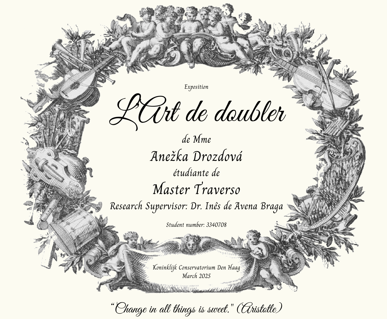Just as variety and change are the core principles of nature itself, they seem to be essential for music, too. This research examines doubles in the repertoire for flute between 1700–1750 as a specific type of variation. Originating as a vocal tradition of embellishing the second verses of airs de cour, the tradition continued in instrumental music by creating doubles mostly for songs and dance forms, such as Menuet, Gavotte or Sarabande and remained popular until it gradually evolved into the variation form in the second half of the 18th century. The role of the flute in this repertoire is unique thanks to the vogue of the airs the cour among flautists and composers for flute. The presented exposition traces the development of doubles in the flute repertoire of the first half of the 18th century. Highlighting the variety of unique compositional styles, the research distinguishes between three typological categories of doubles: diminutive, ornamental, and those presented in sets of variations, typical of a Galant sonata. The examination and analysis of a representative number of doubles led me to extract elements and patterns, typical for each category, and, in turn, this thorough study of the doubles allowed me to play them with a better understanding. Finally, the synthesis of both the theoretical and empirical approaches provided enough information and inspiration to compose doubles for other musical pieces from the same period. These newly composed doubles are included in the collection titled L’Art de doubler, attached to the exposition.
