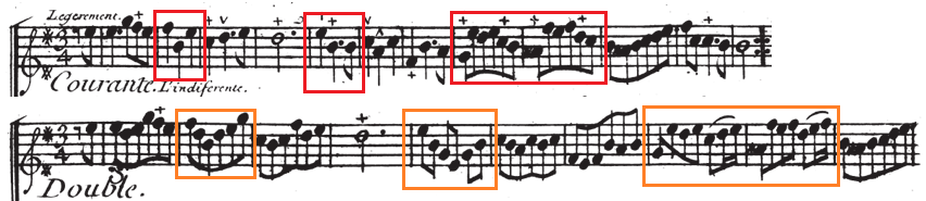 Doubles by M. P. de Montéclair show a beautiful balance between the vocal character of the original melody and the fact that the double itself is purely instrumental. For instance, in the second line of the air Je jure par tes yeux, the elegantly shaped melodic diminutions are alternated with leaps that clearly signal the instrumental character of the double.