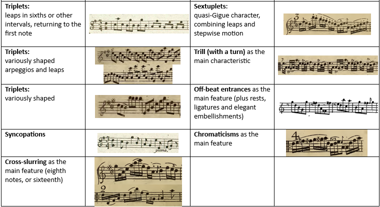 In total, I have examined 44 pieces with sets of variations in the Galant style. I extracted the rhythmical and melodic elements used in the variations and identified in total 37 rhythmic-melodic figures, which served as typical features of individual variations. The analysis of the complete 44 pieces with the identification of the prevalent elements in their variations can be seen in the spreadsheet attached as Appendix 1 to this exposition. The table below provides examples of each of these 37 categories taken from the pieces listed. These examples may serve as a shortcut or an overview of their possibilities of making variations to any similar pieces of music for any musician or a reader of this exposition.