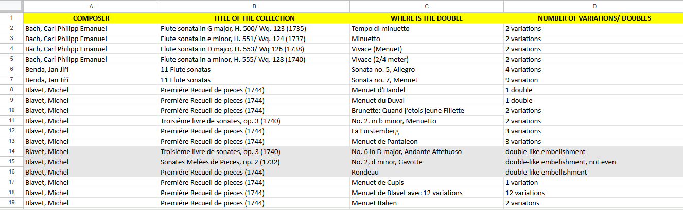 Just as variety and change are the core principles of nature itself, they seem to be essential for music, too. This research examines doubles in the repertoire for flute between 1700–1750 as a specific type of variation. Originating as a vocal tradition of embellishing the second verses of airs de cour, the tradition continued in instrumental music by creating doubles mostly for songs and dance forms, such as Menuet, Gavotte or Sarabande and remained popular until it gradually evolved into the variation form in the second half of the 18th century. The role of the flute in this repertoire is unique thanks to the vogue of the airs the cour among flautists and composers for flute. The presented exposition traces the development of doubles in the flute repertoire of the first half of the 18th century. Highlighting the variety of unique compositional styles, the research distinguishes between three typological categories of doubles: diminutive, ornamental, and those presented in sets of variations, typical of a Galant sonata. The examination and analysis of a representative number of doubles led me to extract elements and patterns, typical for each category, and, in turn, this thorough study of the doubles allowed me to play them with a better understanding. Finally, the synthesis of both the theoretical and empirical approaches provided enough information and inspiration to compose doubles for other musical pieces from the same period. These newly composed doubles are included in the collection titled L’Art de doubler, attached to the exposition.