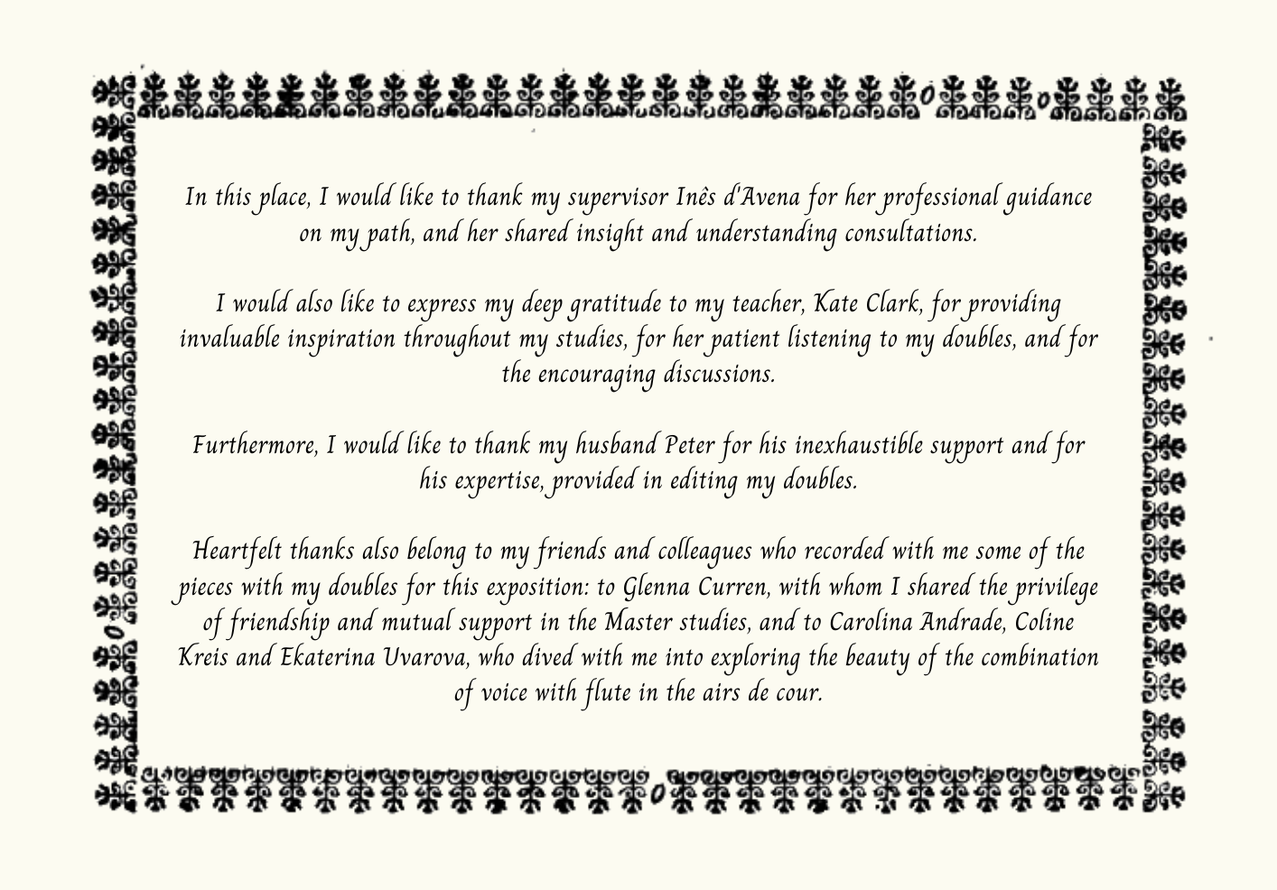 Just as variety and change are the core principles of nature itself, they seem to be essential for music, too. This research examines doubles in the repertoire for flute between 1700–1750 as a specific type of variation. Originating as a vocal tradition of embellishing the second verses of airs de cour, the tradition continued in instrumental music by creating doubles mostly for songs and dance forms, such as Menuet, Gavotte or Sarabande and remained popular until it gradually evolved into the variation form in the second half of the 18th century. The role of the flute in this repertoire is unique thanks to the vogue of the airs the cour among flautists and composers for flute. The presented exposition traces the development of doubles in the flute repertoire of the first half of the 18th century. Highlighting the variety of unique compositional styles, the research distinguishes between three typological categories of doubles: diminutive, ornamental, and those presented in sets of variations, typical of a Galant sonata. The examination and analysis of a representative number of doubles led me to extract elements and patterns, typical for each category, and, in turn, this thorough study of the doubles allowed me to play them with a better understanding. Finally, the synthesis of both the theoretical and empirical approaches provided enough information and inspiration to compose doubles for other musical pieces from the same period. These newly composed doubles are included in the collection titled L’Art de doubler, attached to the exposition.