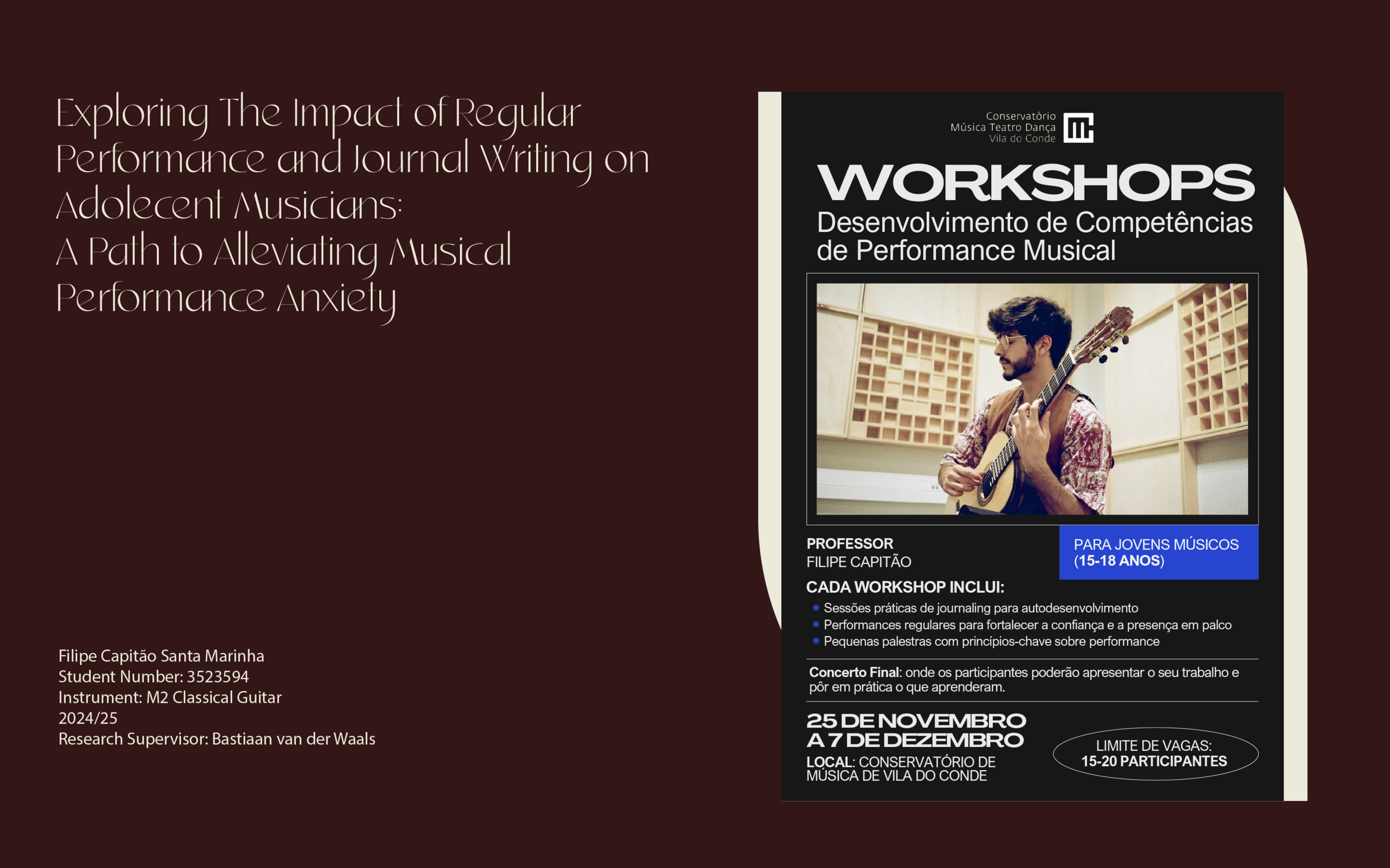 Musical performance anxiety is a challenge that affects many musicians, often hindering their ability to express themselves fully on stage. Drawing from my own experiences, this project explores how regular performance opportunities and reflective journaling can help young musicians overcome these fears. Over two weeks of workshops at the Conservatório de Música de Vila do Conde in Portugal, teenagers aged 15 to 18 will participate in performances, write about their experiences in journals, and discuss their reflections with peers. The goal is to help them better understand their emotions, develop practical strategies, and build confidence on stage. Using questionnaires and journal entries, the project will assess how these tools impact their comfort and growth as performers. Ultimately, the aim is to create a supportive environment where young musicians can face their fears, embrace self-expression, and find joy in their art.