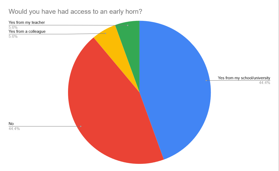 Additionally, I sought to examine the background of horn players at various stages of their education, including schools, universities, and graduates, to determine whether they had any exposure to the natural horn during their studies. A crucial question I aimed to address was whether students had access to these historical instruments and if opportunities existed for them to explore this area of study. Understanding these factors could provide valuable insights into how historical performance practice is integrated into modern brass education and whether accessibility remains a barrier for those interested in learning the natural horn.