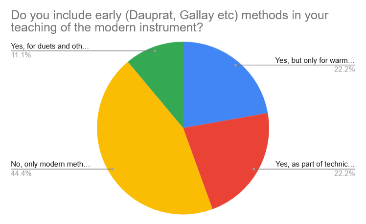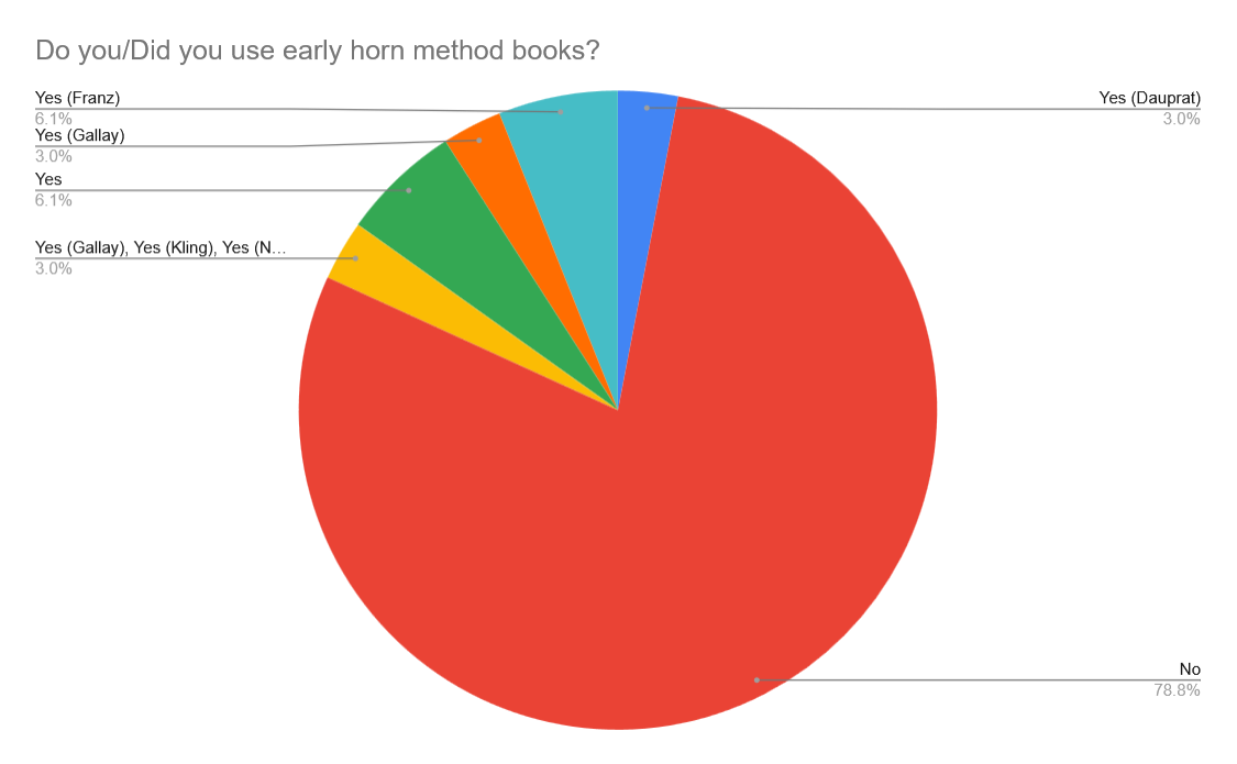 However, it is worth noting that only just over half of the respondents who also teach the horn incorporate early method books into their own teaching practices. When they do, the use of these materials tends to be limited to warm-ups and technical exercises, a common practice in the horn community. It is also worth noting that when these results were combined with the results of the current students, nearly 80% of responders don't use historical (pre-20th century) methods in any way in their learning or teaching.