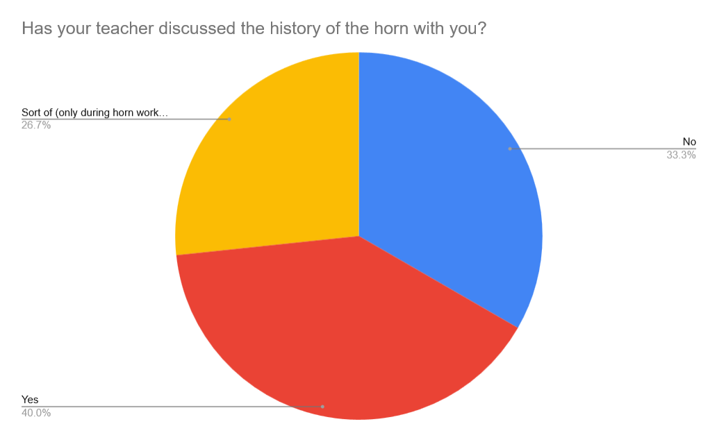 In addition to this, I created a separate survey to further investigate the extent to which students and community horn players (players who do not study the instrument through an institution or who play professionally) are educated about the early horns and the broader history of the instrument. From my own experience, I found that these topics are rarely addressed in lower school education, and any detailed exploration typically only occurs when students begin specializing in horn playing at the high school or university level. This observation was largely confirmed by the feedback gathered from participants in the Prototype Workshop, which is discussed later in this exposition.