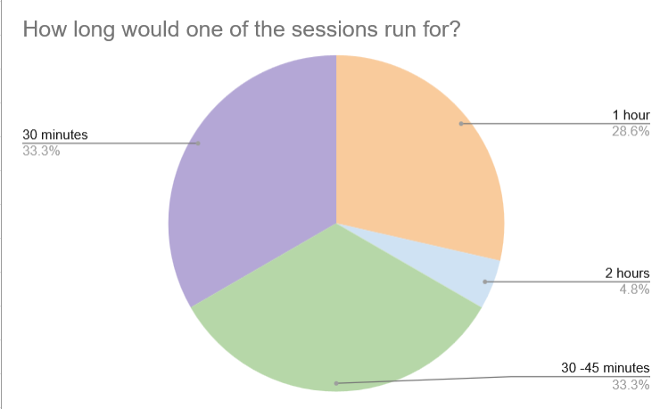 I was pleased to note that the views of the educators and myself regarding the length of time for a workshop were aligned. I knew from experiences with younger children what their tolerance for these types of sessions can be, and knew that whatever I would plan for a workshop would need to be no longer than an hour.