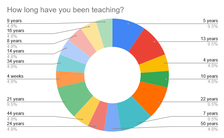 The survey attracted a diverse range of respondents, spanning an age range of forty-four years—from the youngest participant at twenty-two, to the oldest at sixty-six. Additionally, their teaching experience varied significantly, from as little as four weeks to an impressive fifty years in the field. This provided a rich and varied perspective on workshop structures and teaching methodologies.