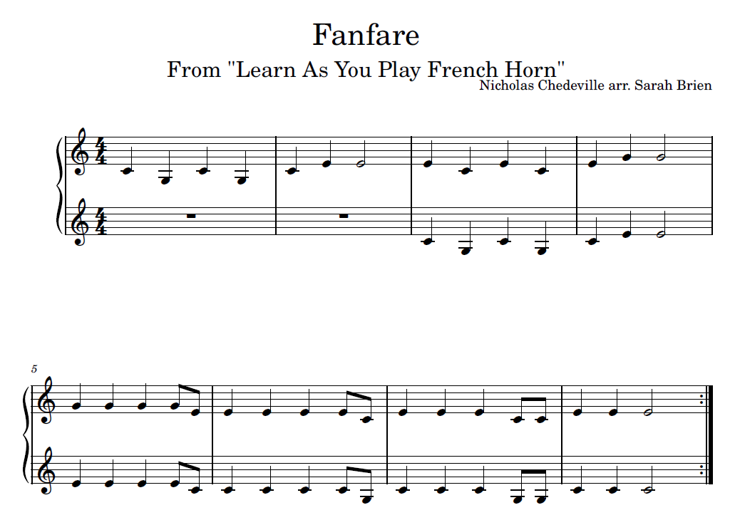 For the junior group, I arranged a set of simplified tunes taken from modern beginner horn methods Learn To Play the French Horn3, Learn as You Play French Horn4, and Starter Duets for Horn5 that remained within a specific range and modified the melodies to utilise only open harmonics. This adaptation proved to be an excellent fit for the group, allowing them to progress through the material efficiently within the given timeframe.