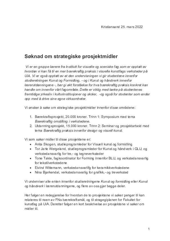 UiA ved arbeidsgruppa KoK hadde i 2022 begynt en omstilling i verkstedene. Med tildeling av strategiske midler kunne man arbeide med synligheten av dette arbeidet og inspirasjon i videre arbeid for både verksteder og egne forskningsprosjekt. Samtlige i gruppa har sitt eget individuelle engasjement i bruk av bærekraftige materialer og prosesser. Tone arbeider for eksempel med plantefarging av tekstiler. Eivind har lært studentene å gjenvinne leire og med prosesser der man ikke alltid brenner produktet. Nina Björkendal oppfordret eggoljetemperaen fremfor akrylfarge. Engasjementet for de ulike fokusområdene har smittet over på flere i gruppa og ledt til samarbeid og felles diskusjoner over temaet.