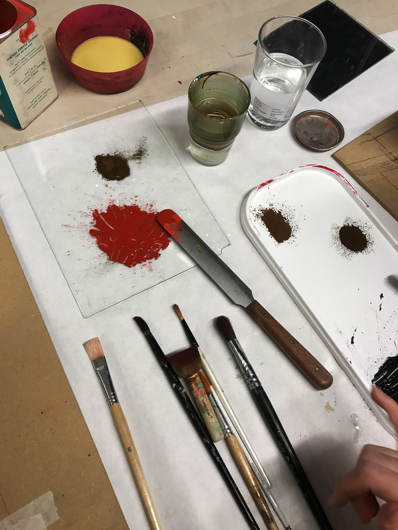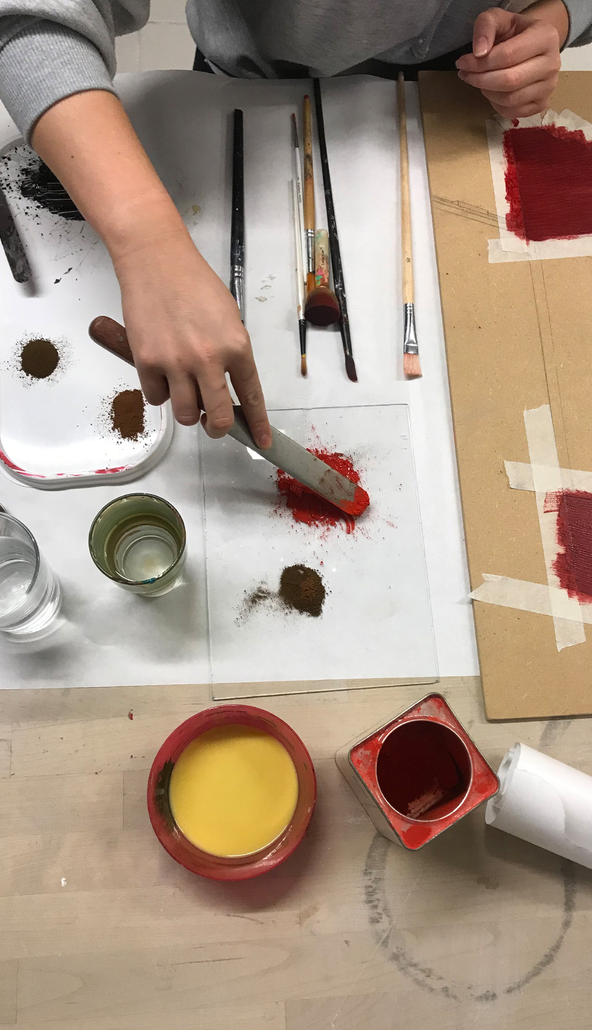 Eggoljetempera er en malingstype med tradisjon som strekker seg langt bak i historien. Denne typen maling både puster og lever sammen med materialet det dekker. Den er ekstremt sterk og diffusjonsåpen. Dessuten har den en matt overflate som gir et spill som få andre malingstyper kan konkurrere med. Vi mener det er en verid i seg selv at studentene skjønner hvor materialene kommer ifra og å lære hvordan ulike malingstyper blir laget.
