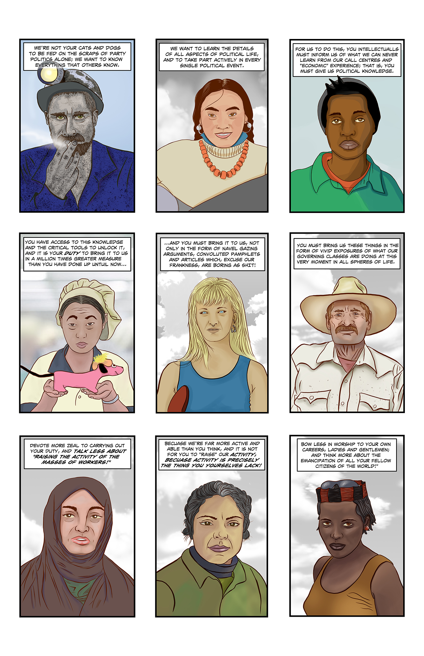 This exposition is Part One of a two part practice led research project. Part One as you will see is a provocation to myself and other academic researchers. The words are my adaption from the original Russian text written in 1901, first published in 1902, and then republished in 1907, of a text entitled: 'What Is To Be Done' by Vladimir Ilyich Ulyanov. The images are all my own work. I am not a professional artists, merely a cultural theorist who is keen to practice, and to learn, as much as possible about the craft of cartooning, comics, sequential art, narrative and politics. Part Two, which will follow this exposition in 2017, will be a written document bringing together comments from Research Catalogue members and others. (If you would like to make comments I would be grateful for any response you may have in regard to your reading of 'A Call for Papers' and in whatever form you may choose to make your comments in.) This second section of this project will be an elucidation of my own research and reasons for making this piece alongside a dialectic engagement with any comments I may receive.