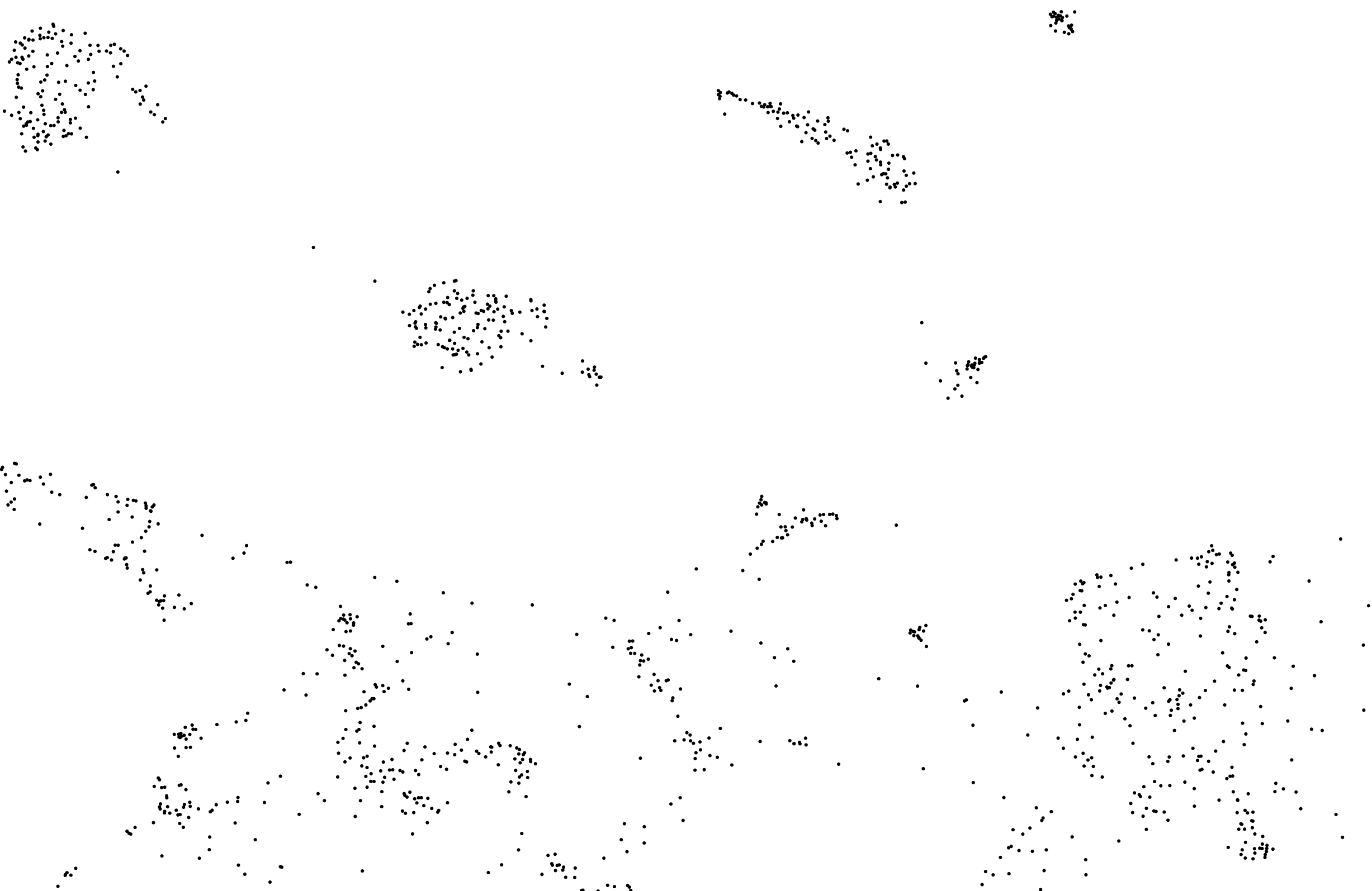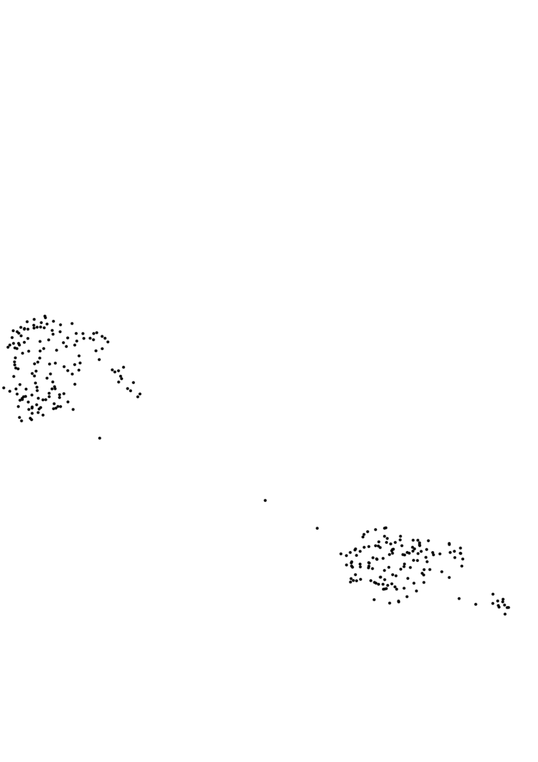 The Computer-Music-System (CMS) uses machine learning techniques and is corpus-based. The initial dataset is the audio recordings of the web project, consisting of about two hours of composed violin passages. This corpus was segmented into many thousands of samples and its audio descriptors (timbre, chroma and others) were used for an unsupervised machine learning model (UMAP). Dimension reduction techniques make it possible to display the entire corpus as a plot in two dimensions (see below, this plots represent the current state of the CMS).