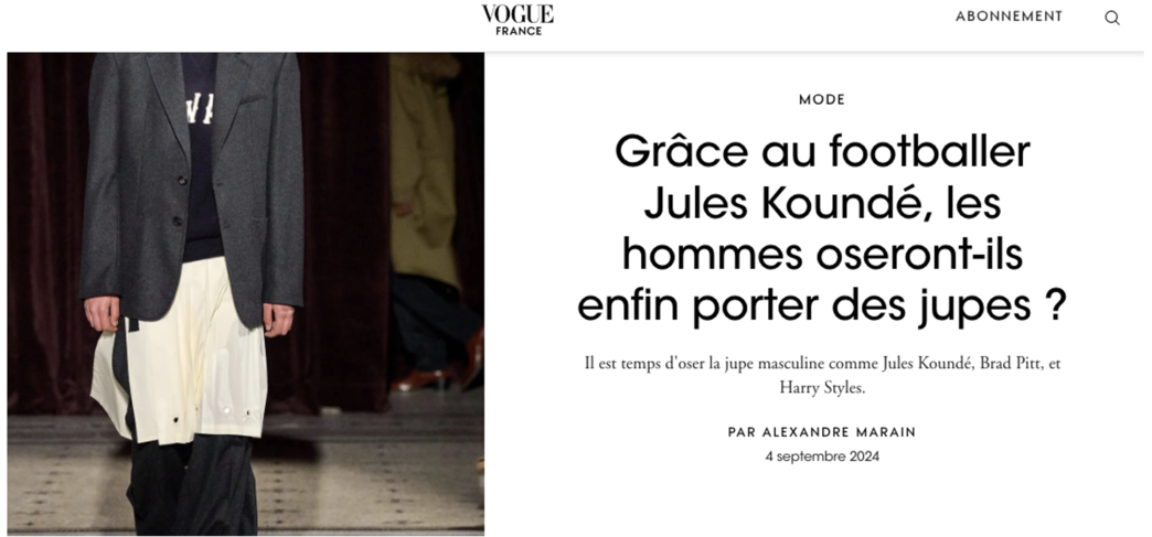 Why did this look cause such a stir? Because in the collective imagination, Brad Pitt is the quintessential straight man. Athletes and even rappers have succumbed to the trend. The latest is none other than professional footballer Jules Koundé. The young man wore a mid-length black skirt during the new French team training session. An outfit that quickly sparked controversy, especially on social networks.