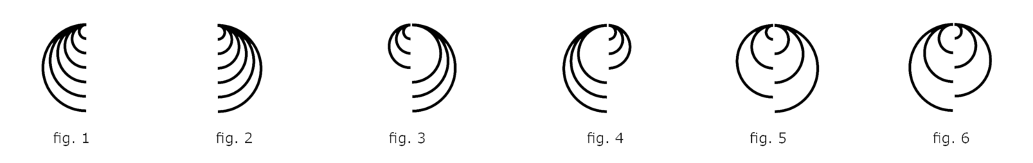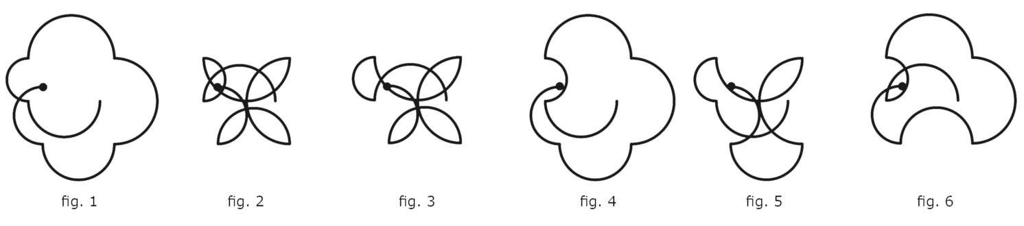 Common to all six drawings is the rule that each subsequent semicircle is rotated 90 degrees counter-