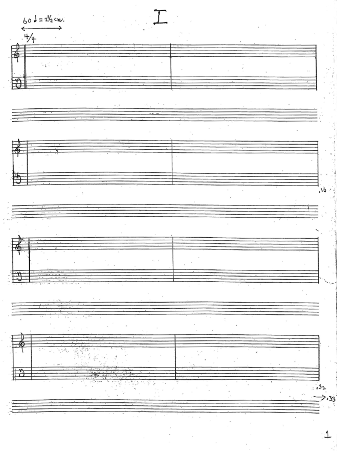 Apart from a conceptually developed second manuscript by Cage himself that served as a birthday present in 1953,[8] David Tudor, the performing pianist of 4’33”’s debut, has twice tried to reconstruct the “silent piece.” The first of these versions was made for a reenactment of the original in 1982 at Symphony Space in New York, thirty years after its premiere. This variant comprises fourteen pages and a cover sheet.