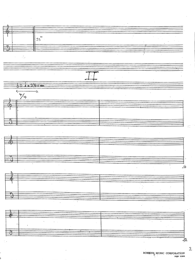 The second reconstruction was written in 1989 for a video documentation on John Cage. Musically, this second reconstruction is more elaborate (since it avoids self-contradictory stipulations) and is therefore considered more adequate. The fact that every page represents thirty-two seconds of performance time, however, has the unfortunate consequence that the first page needs to be turned just one second before the first movement ends.[9] David Tudor’s second reconstruction contains eight pages in total for the three movements.