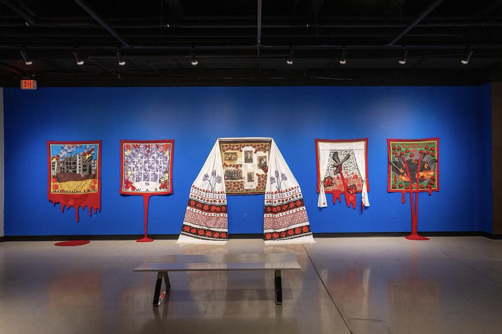 V roce 2017 probíhala v nezávislé kulturní instituci Visual Culture Research Center v Kyjivě[3] výstava TEXTUS: Embroidery, Textile, Feminism, která na příkladu děl ukrajinských umělkyň ilustrovala potenciál textilního umění, v tomto případě navíc často vycházejícího z lokálních tradic.[4] Výstavu kurátorsky připravila ukrajinská umělkyně Oksana Briukhovetská, toho času působící ve zmíněném Centru vizuální kultury.[5] Briukhovetská pracovala během let 2022 a 2023 na sérii textilních koláží Songs and Flowers for Ukraine, skrze níž se vyjadřuje k ruské invazi v Ukrajině.[6] Výchozí inspirací projektu byly rukodělná činnost zakořeněná v historii ženských příslušnic vlastní rodiny na jedné straně a aktivistické umění šedesátých let vyjadřující se v textilu na straně druhé. Volba techniky a vizuality blízké ukrajinskému folkloru akcentuje politické sdělení díla, které ještě umocňuje pomalá a terapeutická povaha celého procesu skládání a sešívání látek, jež umělkyně přirovnává ke snaze znovu spojit rány jako důsledky tragické situace.[7]