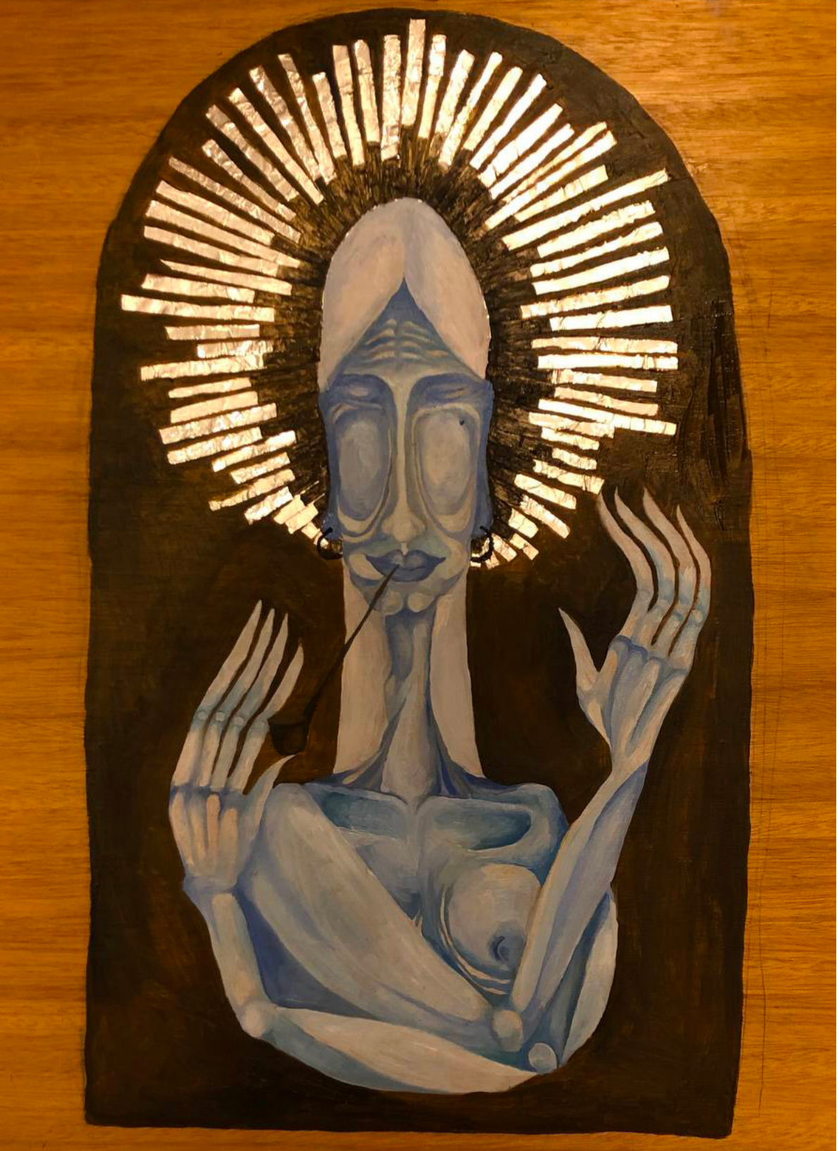 Mezi Ukrajinci se například s válkou ukázal takový fenomén; věci dělají náhle, impulzivně. Ti, kdo se chtěli vzít, se rychle berou, jiní se zase rychle rozvádějí. V důsledku války začali najednou věřit v Boha, nebo se naopak stali ateisty. Pokusila jsem se to promítnout do díla Nový Bůh, kterým má být fiktivní bůh balení cigaret. Toho jsem ztvárnila poté, co jsem v létě 2022 vyslechla v rámci jedné konverzace dvou dívek na nádraží větu, že jedné z nich „dává balení cigaret víc naděje než kterýkoli bůh teď.“ Dílo má být jeho ikonou.